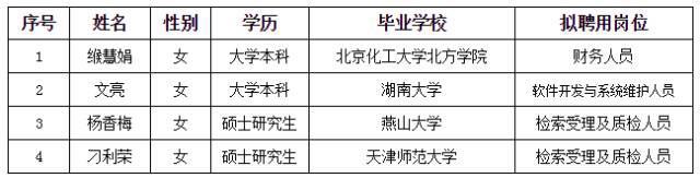 根据《国家知识产权局事业单位公开招聘工作人员实施办法》(国知办发人字[2016]50号)和《专利检索咨询中心公开招聘工作人员暂行办法》(国知检咨字〔2017〕13号)等有关规定,经笔试、面试、体检、政审等程序,拟录用缑慧娟等4人到国家知识产权局专利检索咨询中心工作,现予以公示,具体名单如下: